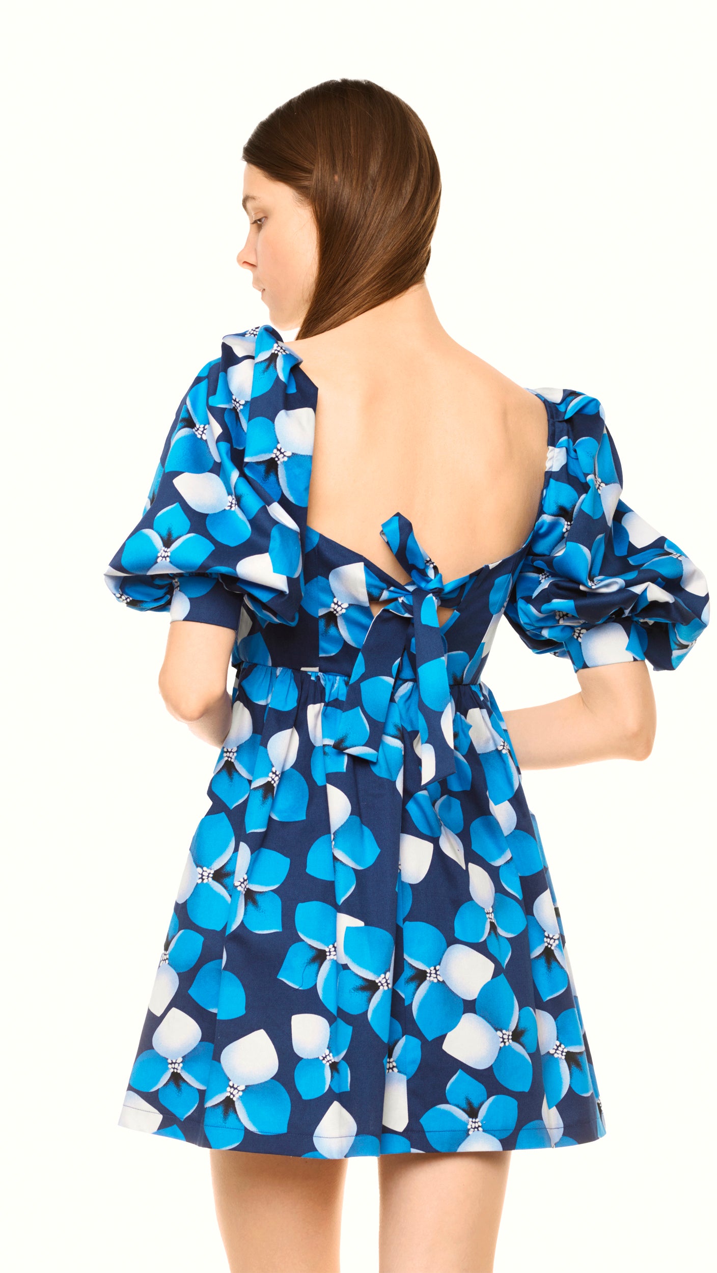 Mini cotton dress with tie and open back. Puffy sleeves and straight neckline.