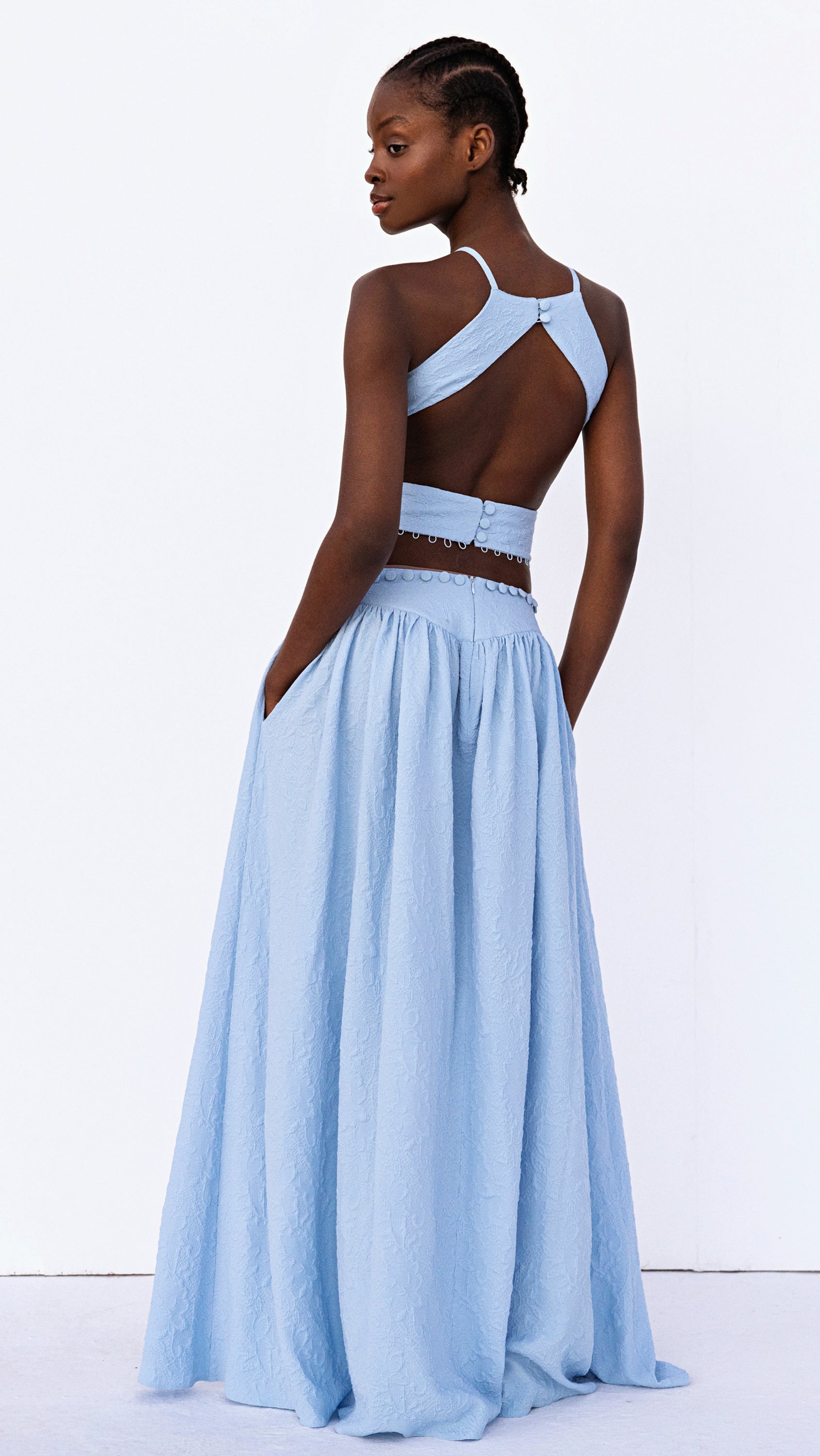 Maxi dress with open back and wide straps. Opening detail at the side and front.